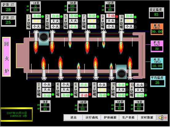 3 炉体画面在炉体画面中可以动态的反映出各个燃烧嘴的燃烧情况、参数的实时值和切换燃烧嘴的手动/自动状态。