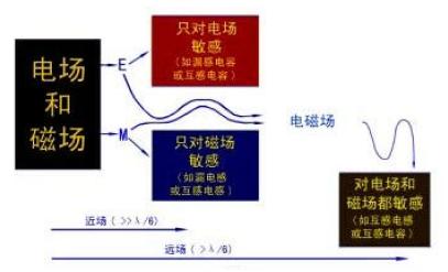 在远大于所关心频率的波长(λ)的1/6 处,电场和磁场汇合成包含电场和磁场的完整电磁场(平面波)。例如:对于30MHz,平面波的转折点在1.5m;对于300MHz,平面波的转折点在150m;对于900MHz,平面波的转折点在50m。因此随着频率的增加,仅仅把导体视为电场或磁场的发射和接收器是不够的,如图16 示。