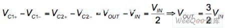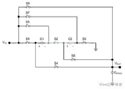 输出电容CHOLD提供输出负载电流。随着这个电容的放电,输出电压降低到期望的输出电压以下,第二个阶段是被激活来将输出电压增高到这个值以上。在第二阶段,C1和C2并联,连接在VIN和VOUT之间。开关S4到S7关闭,而S1到S3和S8打开。因为电容两端的电压降并不能突变,输出电压跳变到输入电压值的1.5倍︰
