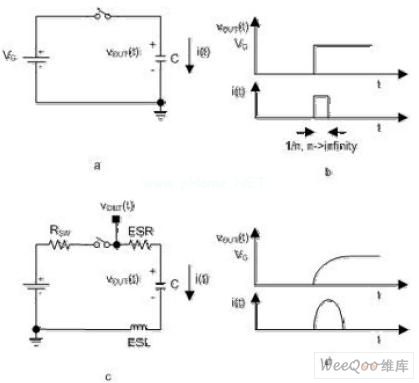 图1︰从一个电压源对电容进行充电(图a和b是理想情况,c和d是实际情况)。