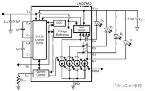 图5:这个开关电容器白光LED驱动器可用于四个LED