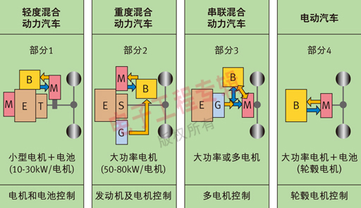 图1:混合动力与电动汽车的分类图。