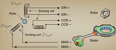 图2显示的就是分解器。励磁线圈配备模拟正弦信号。该模拟信号通过磁耦合(感应)传输到两个传感器线圈,相互设置在90度的位置。对由分解器传回的模拟正弦和余弦信号的评估需要一个轴角数字转换器(RDC),它用来从模拟数据中确定角度位置和速率。