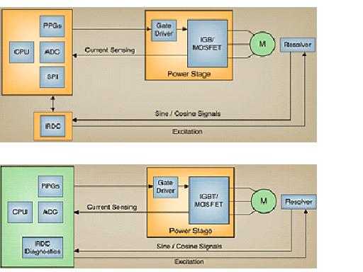 在最简易的情况下,电机控制器包含一个微控制器、一个功率输出级、连接转子位置传感器(分解器)的电机,以及常被作为一个独立电路执行的轴角数字转换器。该控制器产生旋变信号,并基于返回的正弦/余弦信息,快速准确地确定转子的位置和速率。这种信息必须传到微控制器,才能在电机控制计算中被考虑到。外部轴角数字转换器通常经串行外设接口(SPI)连接到微控制器。根据系统设计和轴角数字转换器制造商的要求,该连接也可通过其他串行或并行端口实现。