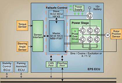 然而,主控MCU仍须评估转向输入装置(倾角传感器)和扭矩传感器,以随时提供正确的转向辅助。EPS控制需要诸如运行速度这样的数据,它通过内部网络来提供(例如CAN总线)。这些信息有利于计算所需的额外转向扭矩,以及将其传送到转向柱上的电机。