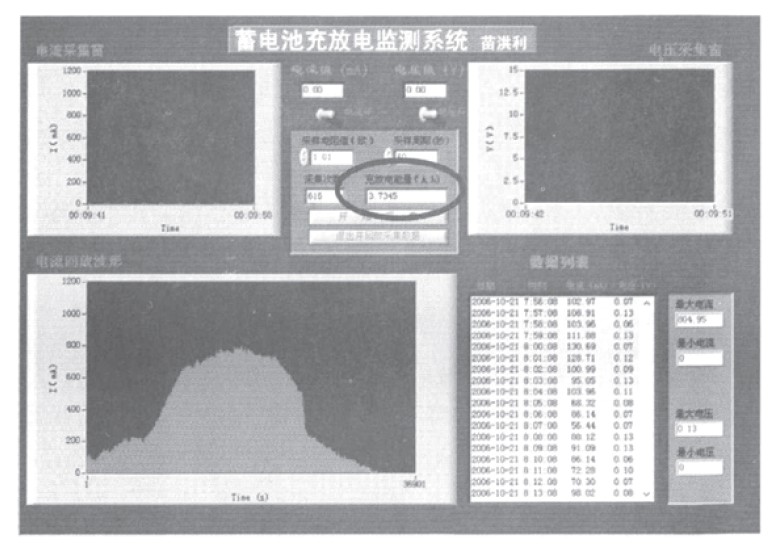 在图2所示的面板图中,设置两个开关以选择是监测电流、电压还是同时监测。分别显示电流实时采集曲线和电压实时采集曲线。并配以数字显示。在采集周期设置窗口,以秒为单付设置采样周期。"开始采集"按钮同时具有暂停功能。全部采集结束后,选择"退出并回放"按钮,在回放波形窗将显示采集电流波形。并计算其曲线下面积值作为电流充放电的安时数(能量值)。在面扳的右下方同时显示带有日期、时间信息的全部数据列表,并显示电流、电压最大最小值。