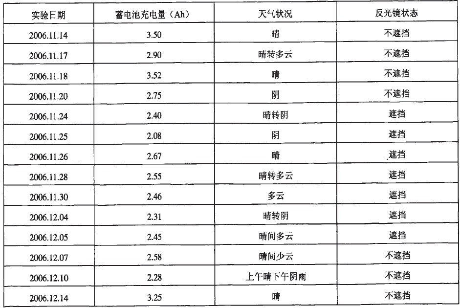 从表2可以看出,反光镜不遮挡时蓄电池平均每日充电量为2.97Ah;反光镜遮挡后蓄电池平均每日充电量为2.42Ah.由此可见,加反光镜后能满足功率输出要求,且每日蓄电池充电提高23%.