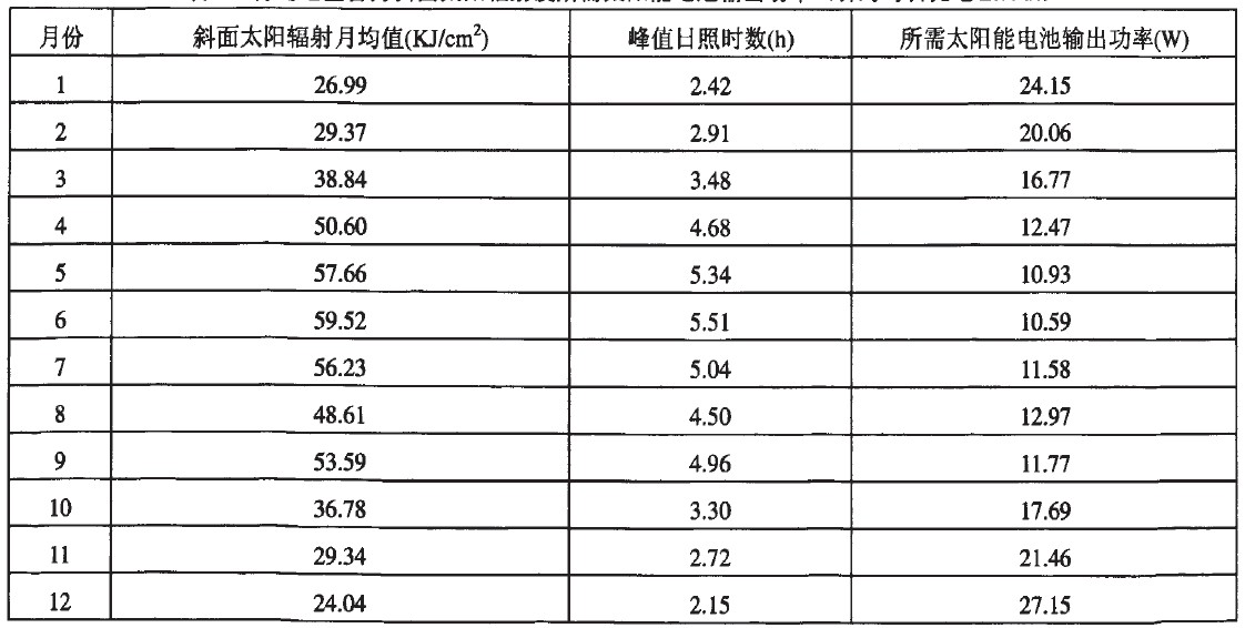 如果以太阳最低辐射的12月为设计月,则太阳能电池的输出功率需要27W,同时其它月份都能保证。