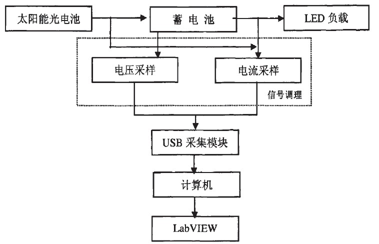 利用调理信号电路对光电池的输出电流和蓄电池的放电电流及蓄电池的充放电工作电压进行一定频率的数据采样,由USB数据采集模块将采集数据送入计算机。在LabVIEW软件平台上进行实时显示和统计分析。原理框图见图1。
