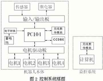 机器人本体的控制系统以嵌入式PC104工控机为核心,并配有输入输出扩展板HT-750和A/D采集扩展板PM-516。采用PC104 作为核心模块, 可将主要精力放在软件和接口的设计上, 而且PC104 的开发、维护和扩展都非常方便。PC104与通用PC和PC/AT标准(IEEE P996) 完全兼容, 可以很快掌握其软、硬件的使用, 并且具备嵌入式控制的特殊要求,为嵌入式应用提供了标准的系统平台[1]。