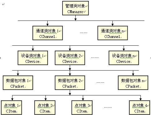 每一个调度程序都会创建唯一的管理类(CManager)对象来管理着所有的其他对象,该对象同时管理着一系列的通道对象。所谓的通道(CChannel)对象其实是一系列的通讯介质的抽象,比如一个串口就可以抽象为一个通道对象,再比如一个网络的端口也可以抽象成一个通道对象。调度程序的通道对象隐藏了各种通讯介质的差别,驱动编制者可以不用关心通道的具体细节。在每一个通道对象的内部又管理着若干的设备(CDevice)对象。这种关系可以这样来理解,比如我们在计算机的Com1口上通过Rs485总线联结了3台设备,在Com2口上联结了一台设备。那么调度程序在运行时就会首先创建一个CManager对象,然后再创建两个CChannel对象让CManager对象来管理,它们分别对应Com1和Com2口。然后在Com1对象内创建三个CDevice对象和三台设备相对应,在Com2对象内创建1个CDevice对象。在CDevice的下一级是包对象(CPacket),设备采集数据的时候总是以包为单位进行采集。在包对象的内部又包含着若干的点(CItem),一个点对应着一个从实时数据库位号到实际设备的连接,从设备中采集到的数据首先被放到点中,然后才送入实时数据库中去的。 另外我们看一下在紫金桥软件中定义设备并进行组点联结的过程,我们以“青岛青智仪器”的驱动程序为例来简要的说明一下整个过程。