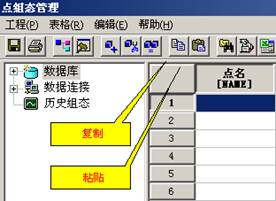 双击“点组态”项即可进入点组态管理。 在点组态管理器中使用鼠标双击点名下的空白处,如下图深蓝色方块所示:
