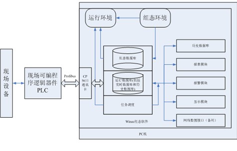 系统配置了操作员站和工程师站,操作员站的上位机采用研华科技的610H工控机,监控系统使用西门子WINCC监控组态软件,它不仅能很好的支持S7系列的CPU,还集成了多种网络连接方式,使上位机与自动化系统的连接工作非常方便。而且它提供了适用于工业的图形显示、消息报警、过程值归档以及报表打印等模块,具有高性能的过程耦合、快速的画面更新、以及可靠的数据管理功能。图4所示为WINCC组态示意图。