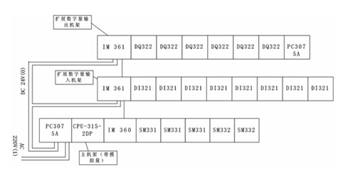 在电厂污水处理控制系统中,根据用户要求及实际情况分析,我们采用西门子公司的S7-300系列产品来完成此项目。参照西门子公司提供的产品技术参数,以S7-300系列中的CPU315-2DP实现控制功能,由于该系统模拟及数字输入输出量较多,采用接口模块IM360、IM361(主机架使用IM360,扩展机架使用IM361)连接扩展的信号模块满足系统要求,其中信号模块包括若干数字量输入模块 SM321,数字量输出模块 SM322,模拟量输入模块SM331,模拟量输出模块SM332。