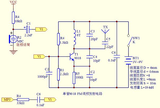 无线FM音频转发器可以将音频信号调制成高频信号,在一定距离内用调频收音机进行接收。无线音频转发器被大量地应用于无线耳机、车载MP3转发器、会议广播、楼宇及公园广播等地方。最简单的无线音频转发器可以只用一个三极管构成,如下图所示: