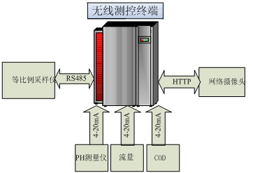 工业远程控制器WNC通过RS232或者RS485以及Modbus协议等方式与一次仪表相连,进行流量、COD以及PH值的采集,并控制等比例采样仪进行采集水样。