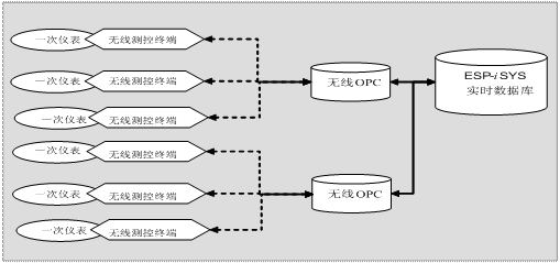 无线数据传输系统采用分布式的设计理念,由浙江中控软件技术有限公司的WNC200系列工业远程控制器连接监控站点现场的一次仪表,实现对现场的一次仪表直接测控,其内部的无线传输系统实现从监控站点到信息中心服务器端的双向数据链路的连接工作。无线OPC服务器作为无线链路的服务器端,实现多个工业远程控制器到服务器的并发连接和数据解析,单无线OPC服务器可支持大于2000个工业远程控制器的并发连接,并将数据以OPC协议的方式向实时数据库提供高效的数据传输。