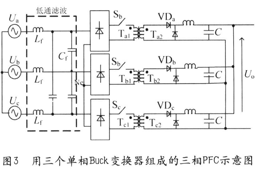 图3用三个单相Buck变换器组成的三相PFC示意图,图3所示Buck型电路的结构比较简单,同全桥电路相似,由于隔离变压器反射电压的影响,其相对于反激电路来说也有较大的电流失真,但其谐波仍可以限定在比较低水平,达到IEC—1000的要求。另外,其可实现的功率等级的大小不如全桥高,但比反激式电路要大。