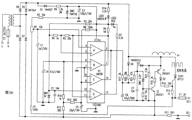 电路原理图见图16。工频变压器T1是降压变压器,D5~D8组成桥式整流,输出的脉动直流不经滤波供电瓶充电。