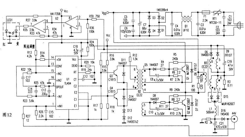 电路原理图见图12所示。该充电器为半桥式充电器。主要性能指标为:输入电压:170-260V;输出电压:44 V(可调);最大充电电流:1.8A;浮充充电电流:200~100mA。