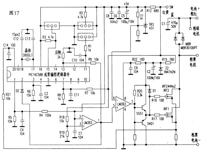 图17由PIC16C58B单片机为PWM核心的控制器,同类产品有英克莱TC22418有刷控制器,小羚羊SPMBC有刷控制器等。