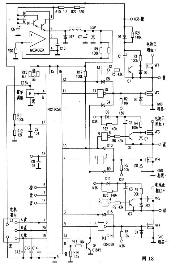 图18是天津中科的PIM6401,9,10KZX无刷控制器。其电路以PIC16C58单片机为核心,完成PWM控制和电极位置识别于一体,使电路更简洁。
