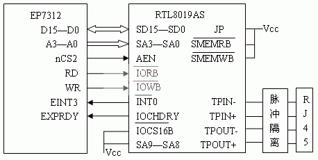 RTL8019默认的I/O基地址是300H,用到的地址空间为300H~3FFH,因此使用到EP7312的低4位地址线,将RTL8019上的SA19~SA10和SA7~SA5接为地,SA9、SA8接为VCC。RTL8019AS使用的是16位数据总线方式,因此,将RTL8019上的IOCS16B引脚通过10K的上拉电阻接为VCC;通过IO模式读写以太网控制器,所以SMEMRB和SMEMWB引脚通过上拉电阻接为VCC。