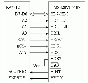 EP7312和TMS320VC5402连接的接口电路如图2所示。VC5402通过HPI与ARM进行连接。ARM先向DSP写入控制字,设置工作模式,然后将访问地址写入地址寄存器(HPIA),再对数据锁存器(HPID)进行读写,即可读出和写入指定的存储单元。主机由两根地址线A2、A1可以寻址到HPI接口的所有控制寄存器、地址寄存器和数据寄存器;由HBIL、HCNTL1、HCNTL0区分16位数据的高、低字节。当向HBIL=0的地址写入数据时,表示是第一个字节,向HBIL=1的地址写入数据表示第二个字节。寻址过程中HCS要为低电平。