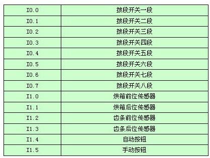 一、 系统输入 1. 由于热缩包装加热时间长短要可调,该系统采用了 8档的拨段开关,分别对应不同的时间长度。 2. 四个接近开关,分别位于烘箱汽缸和齿条汽缸的前后位。 3. 机柜面板有手动和自动按钮,控制系统的运行方式。 4. 设有急停开关,保护系统