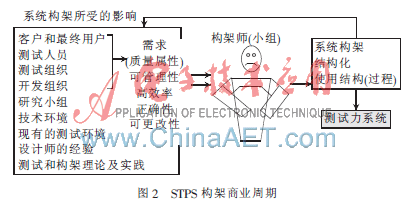 构架是技术、商业和社会等诸多因素作用的结果,而构架又能返回并影响到开发环境,这种相互影响的周期,称为构架商业周期(ABC)[9]。ABC陈述了当设计师开始构建系统时的各种影响因素,并指出了特定的质量属性需求通常产生于组织的业务目标。STPS系统根据涉众及质量属性所构架的商业周期如图2所示。这里的最终用户是测试人员,用户则是测试组织。