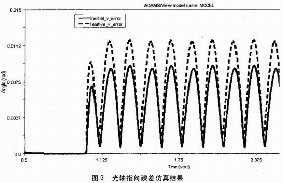 以随动系统复现相对惯性空间稳定的输入为例,为进一步比较两种方案,我们利用ADAMs软件和MATLAB软件一起进行了位标器运动学、动『J学和控制系统联合仿真。仿真条件假设目标在空间静止,在中环通道,分别利用陀螺速度反馈和测速机速度反馈,在弹体摆动情况下,进行目标指示信息的随动,对指向误差(即光轴与视线的夹角)的大小进行记录,仿真结果如图3所示。