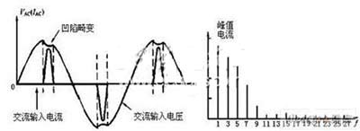 (a) 电网输入端电流和电压的畸变 (b)峰值电流中的各次谐波分量频谱