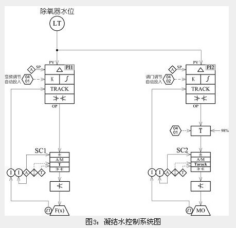 (4)凝结水泵再循环调整门是为了保证凝结水系统在低流量时凝结水泵在安全工作区内运行的,该控制回路的被调量是凝结水泵出口母管压力,当凝结水泵采用变频调速系统后,转速越低,出口压力越低,为了保证凝结水泵的安全,防止泵体汽蚀,在再循环调整门的控制指令输出上叠加一个与除氧器水位调整门具有函数关系的指令,当在变频运行时,控制再循环调整门开度。