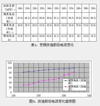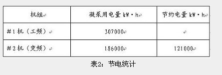 表2是某半个月的电能统计,做一个同类机组的横向比较,可以看出凝泵用电减少许多。