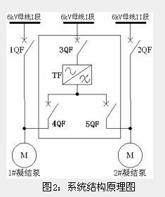凝结水泵电机为6kV/1120kW电机,设计时有一定裕量,每台机组配备二台凝结水泵,一台运行,一台备用。通过对机组凝结水系统和凝结水泵运行方式、动力系统结构的研究分析,提出一拖二自动工/变频切换控制方案。由于凝结水泵属一用一备运行方式,因此采用一拖二方案可以提高变频设备的利用率,保证系统具有良好的节能效果。另一方面,凝结水泵具有定期设备轮换的制度,为降低系统操作的难度,系统采用高压开关等自动切换装置,从而,使得系统操作简便、安全可靠。具体系统结构原理如图2所示: