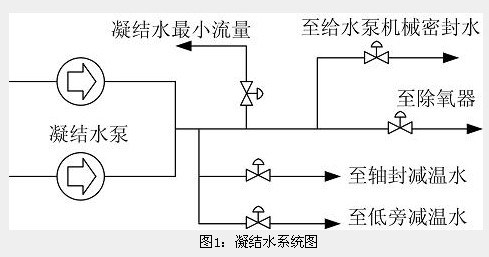 在汽轮机低压缸内做功的蒸汽在空冷岛冷却凝结之后,集中在凝结水箱中,凝结水系统的作用是通过凝结水泵及时的把凝结水送至除氧器中,维持除氧器水位平衡。保证凝结水泵连续、稳定运行是保障电厂发电机组安全、经济生产的重要环节之一,凝结水系统如图1所示。