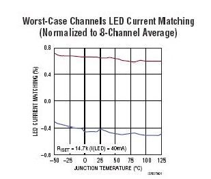 LT3760 采用自适应反馈环路设计,该设计调节输出电压以使其略高于 LED 串的最高电压。这最大限度地减小了通过镇流电路损失的功率,并帮助优化了效率。图 2 中的电路提供高于 90% 的效率。这很重要,因为消除了任何散热需求,从而实现了占板面积非常紧凑的扁平解决方案。就驱动 LED 阵列而言,同样重要的是,提供准确的电流匹配,以确保在整个仪表板上保持背光照明亮度一致。LT3760 在 -40度 至 125度的温度范围内保证 LED 电流变化不到 ±2%,而且正如在图 5 中能看到的那样,它的典型值较接近 ±0.5%。
