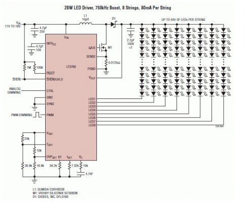 由于大多数汽车 LCD 背光照明应用都需要 20W 至 35W 的 LED 功率,所以 LT3760 设计为满足这些需求。该器件可以将汽车总线电压 (6V 至 18V / 标称 12V) 升高至 44V,以驱动 8 个并联 LED 串(每串含有 10 个 80mA 的串联 LED)。图 4 显示了 LT3760 驱动 8 个并联 LED 串的原理图,每串由 10 个 80mA 的 LED 组成,总功率为 28W。