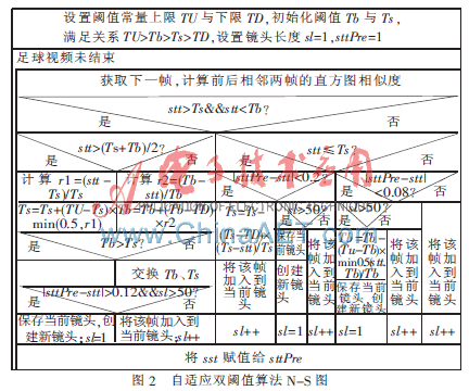 基于双阈值的分割算法的基本思想是:设置一个较大的阈值Tb和一个较小的阈值Ts,当直方图的相似度小于Ts时,分割镜头出现;当相似度大于Tb时,没有分割镜头出现;当相似度介于Tb与Ts之间时,表明阈值设置不合理,若是漏检,则应降低Tb,若是误检,则应加大Ts。算法的关键是判断漏检还是误检以及动态调整阈值的策略。为了消除上述原因形成的误检镜头,分割算法引入了镜头长度(shotlength,即镜头内帧数)sl,当检测到镜头变换时,首先判断sl是否小于某一临界值,如果小于则认为是误检,不进行镜头分割。具体的算法步骤如图2所示。