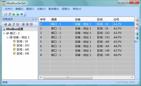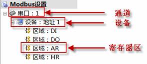 当增加了一个设备之后,该设备就自动地拥有了4个区域,分别是DI、DO、AR、HR区域。它们和Modbus命令的对应关系如下表所示: