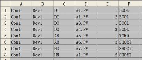 通过Excel,结合紫金桥软件的点组态界面的导出到Excel编辑的功能,可以快速的生成此表格。然后使用批量导入功能,就可以迅速的创建大量的寄存器。
