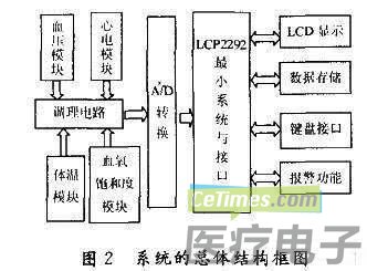 由图2可看出整个系统以ARM 7系列芯片LPC2292为核心,在其外围扩展一些外围电路,从而实现了对人体生理参数:心电、血压、血氧饱和度、体温的安全检查。系统通过心电模块、血压模块、血氧饱和度模块、体温模块采集人体的生理参数、调理电路对这些信号进行滤波和放大,LPC2292自带的A/D转换器将传输过来的模拟信号转换为数字信号,最后人体的各参数指标通过LCD显示。