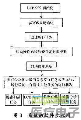 本系统的软件设计主要包括ARM的应用程序的开发和μC/OS-Ⅱ操作系统的移植2个基本部分。ARM的应用程序主要包括LCD显示程序、 FLASH存储程序、USB通信程序、键盘扫描程序、A/D程序和报警程序等。μC/OS-Ⅱ操作系统是协调LPC2292对程序的任务管理和调度。整个系统的软件流程图如图3所示。