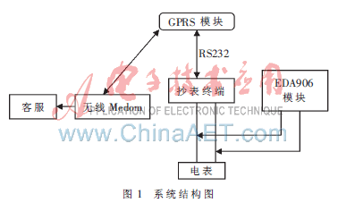 GPRS远程自动抄表系统由客服、GPRS模块、抄表终端、EDA9060模块和电表组成。采集终端实时采集用户的用电数据,通过GPRS将数据汇集到服务器[3]。
