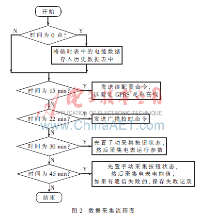 系统在自动抄表时采集电表的电能值、电表运行参数和电网状态值。在采集过程中首先通过给采集终端发送一个读配置命令来验证是否在线,如果采集终端收到了这个读配置命令,则不进行任何操作,否则对GPRS模块进行复位操作。系统将一天分成24次进行采集(每小时采集一次),便于进行查询与分析。系统在每个整点的15 min时发送读配置命令, 22 min时发送广播校时命令, 30 min时发送采集电表运行参数和电网状态命令,45 min时发送采集电能命令。采集终端在整点时自动采集电表的电能值,并将数据进行存储,方便用户对历史数据的查询和对照。