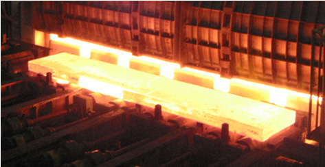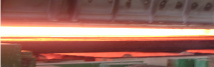 存放在板坯跨的板坯,按生产计划所编排的顺序,用半门吊放在上料辊道上,然后送到称重辊道上进行板坯的重量和标号的核对,核对合格的板坯送往板坯测长辊道进行板坯长度测量,测长后按生产计划安排通过炉前装料辊道分别送到四座加热炉,板坯在炉前装料辊道上按指定的炉前位置完成准确定位,然后由推钢机或装钢机通过滑道或直接抬升前进送往炉内。将其推入加热炉内的固定梁上,再由步进梁托起板坯,使板坯在炉内步进式地进行加热。为使板坯准确停在固定梁上并使板坯间隙正确,在炉子入口处设有激光位置探测器检测板坯的位置。