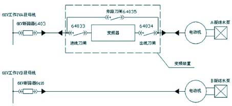 #4机组变频器采用一拖一的接线方式,变频器与电动机的连接方式如附图所示,一台机组采用一套变频器,即一台机组一台工频运行,一台变频运行。考虑凝结水系统的可靠性和变频器检修隔离方便,变频器需增加大旁路开关。