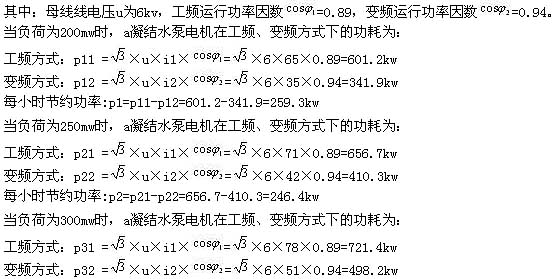 考虑夜晚负荷较低,所以,可以认为机组每天在200mw、250mw和300mw三个负荷点分别运行t1=12h、t2=6h、t3=6h,则a凝结水泵变频器系统一天可以节能: