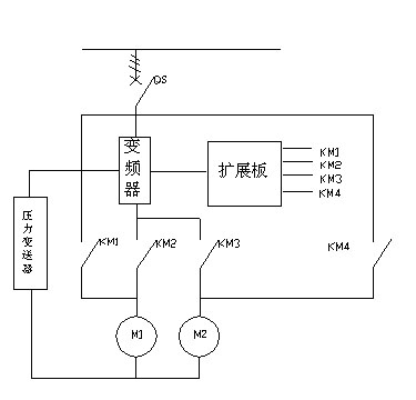 3) 系统采用一拖二控制方式,采用压力变送器反馈电流信号(4—20mA)至变频器中央处理器(CPU),经PID控制组成闭环控制系统。其输出频率的大小由作用处理器控制,使电机的转速自动增加或降低;当压力超过设定的目标值时即(>5%)其中第一台电机转为工频运行,变频器启动第二台电机变频运行,保持水压恒定。这样不但减小了电动机的无功功率,而且提高了水泵的工作效率,节约了能源。