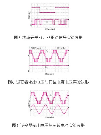 图5为功率开关s1、s5驱动信号实验波形,功率开关s1~s4均工作于高频pwm状态,功率开关s5、s6工作于基频状态。图6为逆变器输出电压与箝位电容电压实验波形,uo为逆变器输出的五电平电压,uo为逆变器箝位电容电压,由于正、负半周期地对箝位电容进行充、放电,使得电容电压存在较小的波动,但通用调制策略使得箝位电容电压达到了较好的平衡。图7为逆变器输出电压与负载电流实验波形,il为负载电流(电阻r两端电压),rl负载使得负载电流具有较好的正弦度。